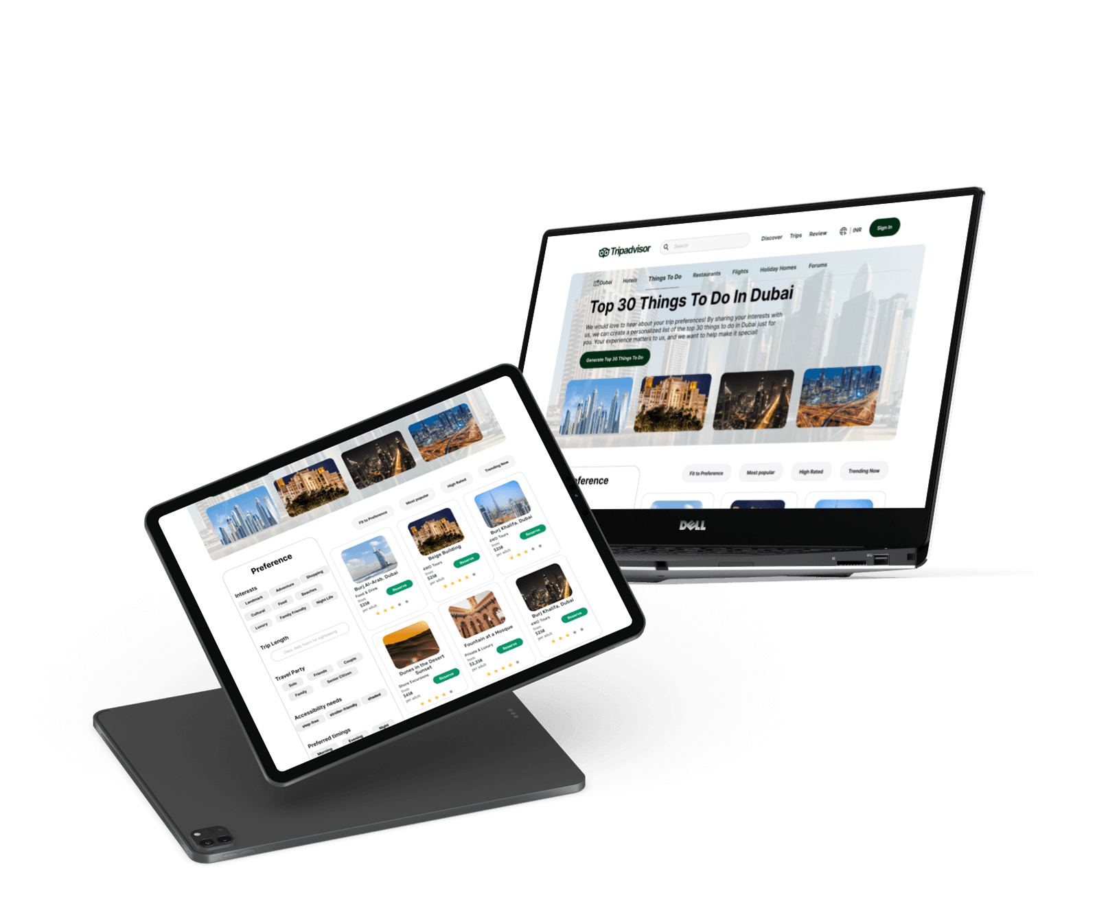 The redesigned TripAdvisor Dubai “Things to Do” desktop page focuses on helping first-time visitors quickly discover and plan activities tailored to their interests. When a new user arrives (without prior login or browsing history), the interface presents a short preference onboarding flow, asking about their travel style, activity type, and mood. Based on these inputs, the system intelligently generates a personalized list of the Top 30 Things to Do in Dubai.